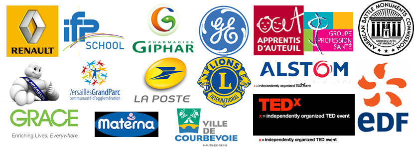 Ces organisations font confiance à Coaching Go : L’Oréal, Renault, ABMC, EDF, Alstom, Michelin, IFP School, Ville de Courbevoie, General Electric, Les Apprentis d’Auteuil, L’Oréal, WR Grace, Materna, Versailles Grand Parc, Groupe Profession Santé, Giphar, La Poste, Le Lions Club, Tedx…